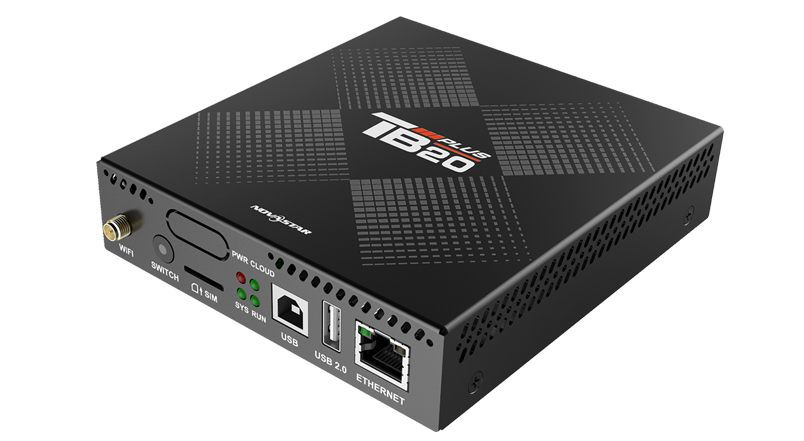 Multimedia Player TB20 Plus: dispositivo LED 4K, 650k pixel, Wi-Fi, controllo remoto, Android 10. Perfetto per display commerciali e smart city.