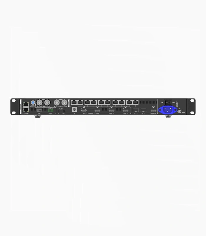 Le 10 porte Ethernet Gigabit consentono una distribuzione efficiente del segnale video, con ogni porta capace di gestire fino a 650.000 pixel (con profondità colore 8-bit). Il sistema supporta inoltre 2 porte fiber ottiche da 10G, con OPT 1 auto-adattiva che può funzionare sia come ingresso che come uscita, mentre OPT 2 offre funzioni di copia e backup.